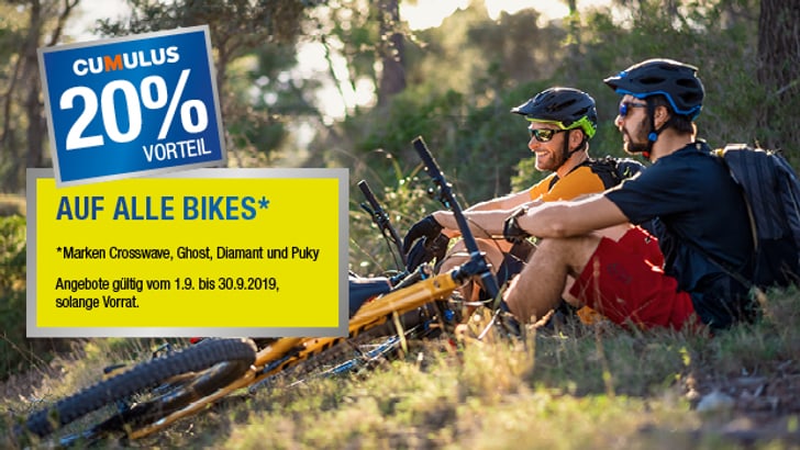 Profitieren Sie vom 1. bis zum 30. September von einem attraktiven 20% Cumulus-Vorteil auf alle Bikes der Marke Crosswave, Ghost, Diamant und Puky und auf alle Fitnessgeräte, online wie auch in Ihrer nächstgelegenen Filiale.